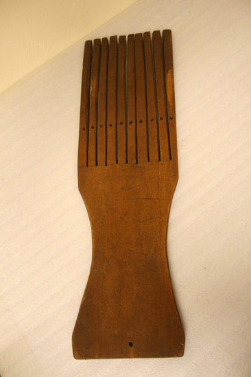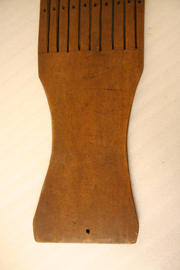 Wooden tape loom. Rectangular piece of wood with slightly shaped body. Sides curve inward slightly in middle. Top of tape look divided into 10 thin rectangular splats with a hole at the bottom of each splat. Large hole at base of tape loom for hanging.
