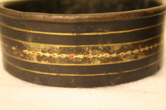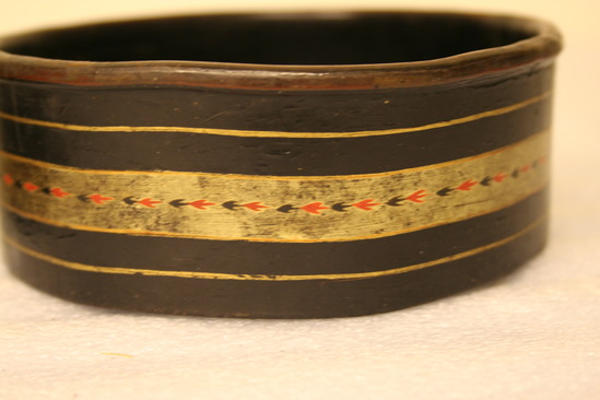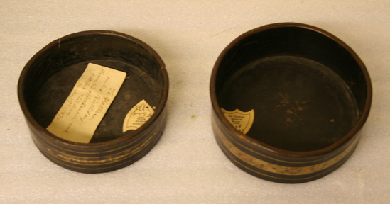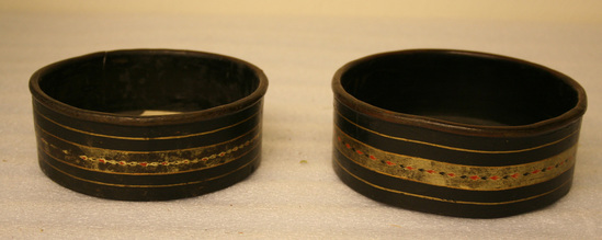 A - Small round container. Wood painted black with rounded lip. Interior painted black with small sprig painted in gold in center. Around outside thick band of gold paint with red and black leaf design. Thin band of gold above and below thicker band. B - Small round container painted black with rounded lip. Interior painted black. Around outside thick band of gold with red and black leaf design. Thin band of gold above and below. Paint very worn. Handwritten note glued on inside of container "To Father/on his Birthday/From his affectionate and/grateful children/June 19th 1867"