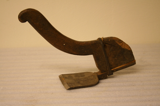 Curved handle with blade attached with iron rings. New piece of wood had been wedged between handle and blade, probably to help hold it on.