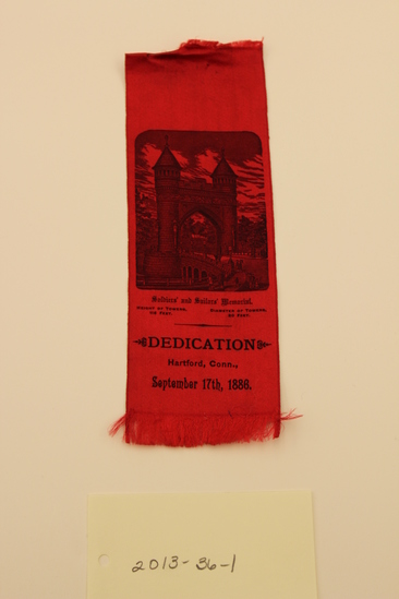 G.A.R. soldiers' and sailors' memorial dedication ribbon. Red satin ribbon with fringed edges. At center inside a rectangular box is an image of the monument. Below the monument in black printing: "Soldiers' and Sailors' Memorial / HEIGHT OF TOWERS. / 115 FEET. / DIAMETER OF TOWERS. 20 FEET. / DEDICATION / Hartford, Conn., / September 17th, 1886."