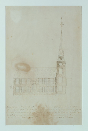 Pencil sketch of First Congregational Church of Litchfield by Emily Noyes Vanderpoel. Copied by Vanderpoel from the original sketch by Louise Lewis.[name of original artist incorrect - according to Vanderpoel's "Chronicles" the drawing is credited as being done by Mary Ann Lewis] Sketch shows profile of building with spire of church at front of buidling. Large window in center of side with arched top (above where pulpit would have stood inside building) Six windows on each side of center window - three on second floor and three on first. Framed under glass