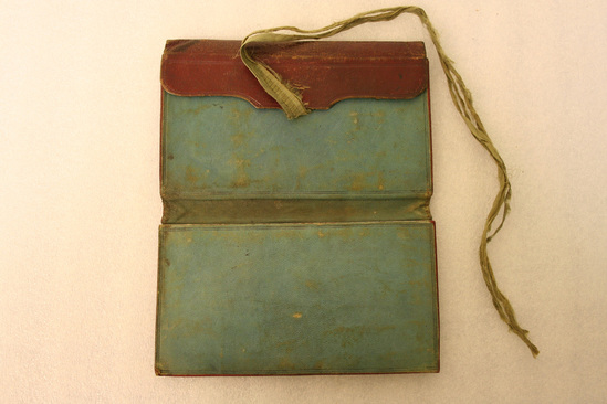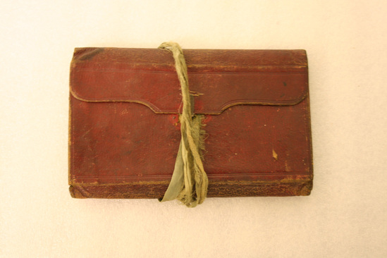 Dark red leather tri-fold wallet with blue fabric interior. Two interior accordian style pockets, lined with marbelized paper. Written in ink below top flap "Amus Chase's/Oil Creek" On front of wallet below flap embossed, gold writing "Peter Lanman" Metal clasp and fabric tie to close.
