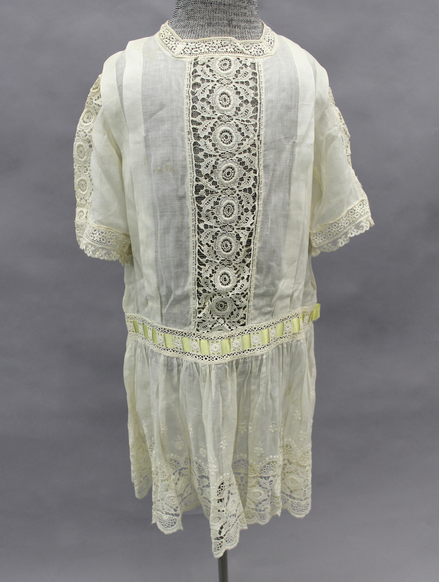White sheer cotton child's dress; short sleeves with wide lade insertions and lace edge; square yoke with lace edge; pleats and wide lace insertion on center front panel; dropped waist with yellow satin ribbon woven through embroidery; skirt with embroidery and wide lace hem border; center back opening with hooks and eyes and buttons