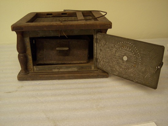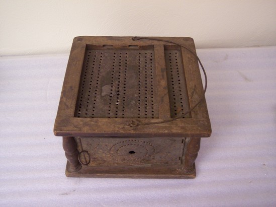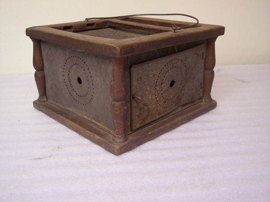 Wooden frame with flat top and bottom mortised and tenoned. Traces of red paint. Tin sides perforated with concentric circles and diamonds pattern.