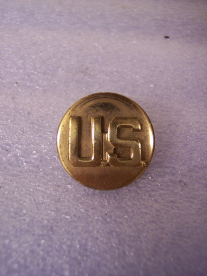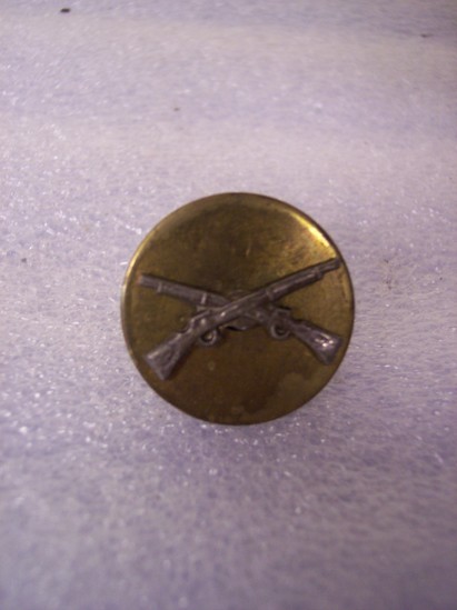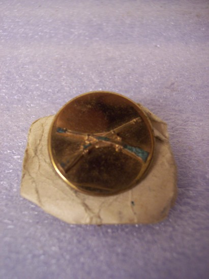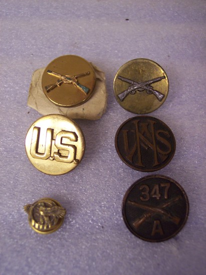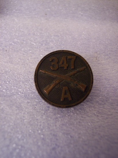 A: Round metal pin, gold colored, with pair of rifles crossed in center. Pins A and D are a set of infantry pins. B: Round metal pin, gold colored, with "U.S." in center. Denotes that the wearer was enlisted. C: Round metal pin, copper colored, with U/N/A/S layered on top of each other D: Round metal pin, gold colored, with two rifled crossing each other. Pins A and D are a set of infantry pins. E: Round metal pin, bronze colored, with crossed rifles in center, above "347" and below "A" F: small round metal pin, gold colored, eagle with spread wings which extend past diameter of button. This pin is commonly referred to as the ruptured duck.
