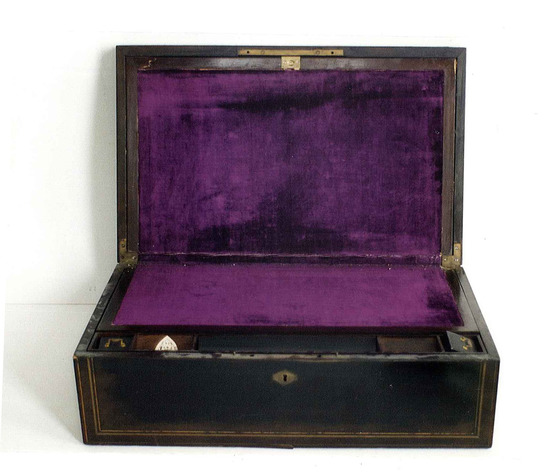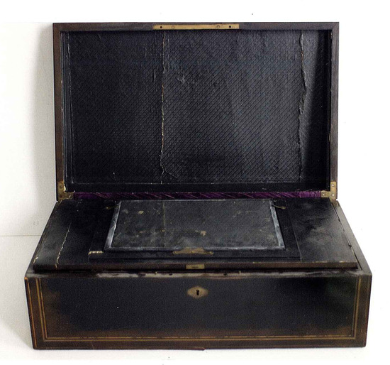 Traveling or portable writing desk and toilet case. Belonged to James MacFarlan (1796-1884) of Brooklyn, NY. Black lacquer case with brass inlaid bands, brass nameplate inscribed: "James MacFarlan". Stamped black leather interior, with stand up mirror, folding over to writing service with compartment for quills/pen, 2 glass inkwells within leather cases with spring top closures. Compartment beneath writing surface complete with 2 cut glass tumblers with silver tops, 2 cut glass bottles with silver tops, 2 boot hooks combined with button hooks with ivory handles, 2 cork screws, 2 pair of scissors, 1 razor, 1 paper cutter, 1 manicure, 1 knife, 1 tool for ears, 1 clothes brush, 1 hat brush, and 1 shaving brush.