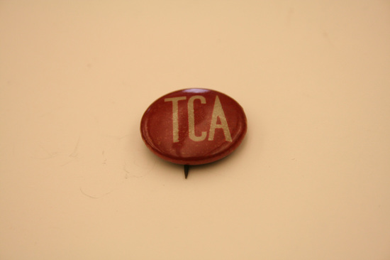 Round button with stick pin on back, dark red face, white lettering "TCA"