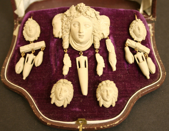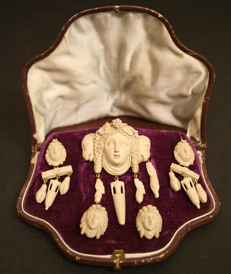 This set of jewelry was purchased by Julius Deming Perkins and Margaretta Dotterer Perkins on their honeymoon tour of Europe in 1868. They purchased the set while in Italy. They sailed on the "Persia" of Cunard Lines and toured Europe, Egypt and the Palestines. The archives contains letters of their travels