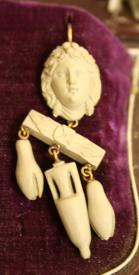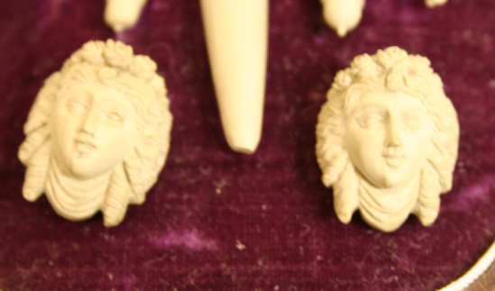 A-C - all made of lava of Mt. Vesuvius. A - Brooch - Large carved woman's head in center with bunches of grapes and grape leaves in her hair. Hair ends in large curls on either side of her head from which hangs a single grape leaf. A wine caraff hangs from her neck. On each side of her head is a small head of a goat or monkey. Hanging from the lip of one is a grape leave with an unopened flower. B - Earrings - For pierced ears. Gold loop on back of each earring. Womans head at top with grapes bunches and leaves in hair. A horizontal bar hangs from bottom of woman's head with two unopened flower buds and a wine caraff in the center. C - Cuff Studs - Each stud is a carved woman's head with grape bunches and leaves in hair. Swag of fabric under chin. D - Case - brown leather case lined on lid with blue silk and on base with purple velvet. Base contructed of wood and cardboard. Brass clasp to open and hinges on back side of case.