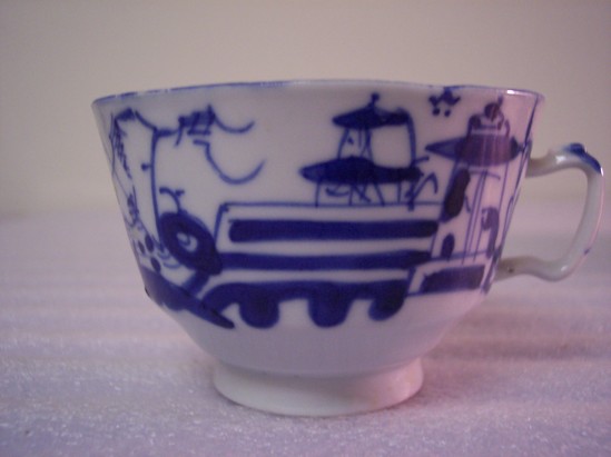 Round footed teacup. Blue and white. Handle is rectangular with a small, raised thumb rest.