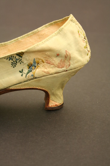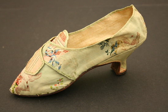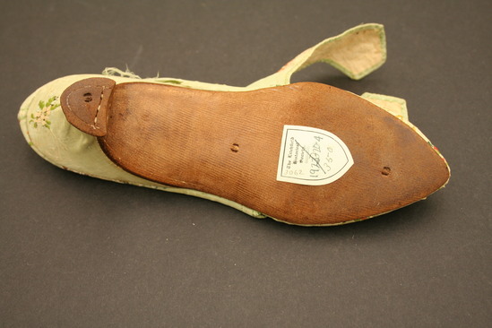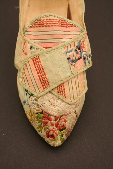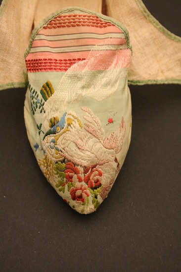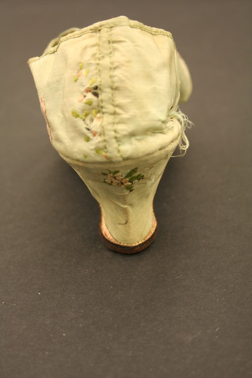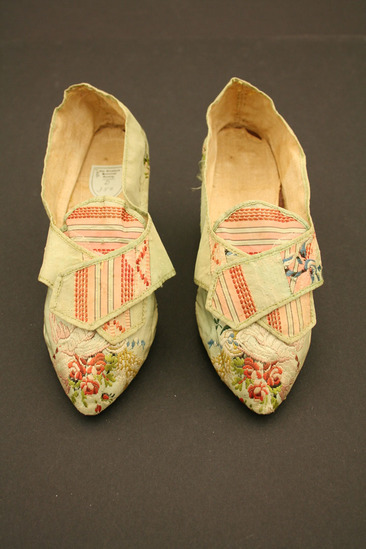 Green silk brocade woman's shoes with silk tape binding; lined with linen; grained leather sole; Italian style wood heel covered in same silk brocade; brocade has embroidery of clusters of flowers in white and pink; large floral design embroidered on toe of shoes in pinks and whites with yellow, blue and green; two flaps fold over tongue of shoe on top - one flap embroidered with floral design, other flap embroidered in vertical striped design of peaches and pinks; tongue of shoe also embroidered with striped lines in pinks and peaches