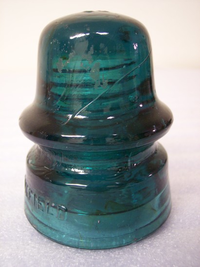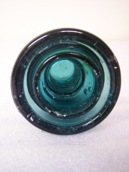Blue-green glass insulator for an electrical conductor. Heavy. Dome-shaped insulator is hollow in column in the center. Inside the top of the insulator are threads to screw this object firmly onto the conductor. Irregular bubbles, wrinkles in the glass, and some threads of color indicate that these items were probably mass-produced quickly. There is a hollow area between the exterior and interior surfaces of the base where the insulator would rest onto a cylindrical projection to seal the interior from weather and debris.