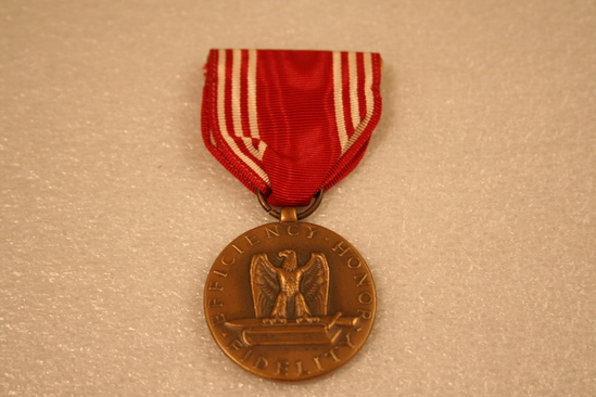 U.S. Army Good Conduct medal awarded to William Warren. Round medal, gold colored. On front, raised image of eagle holding a sword and resting on a book. Printed around image of "Efficiency/Honor/Fidelity" Obverse - raised border of laurel branches, star in center with words "For Good/Conduct" around it. Suspended from red and white striped grosgrain ribbon.