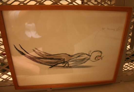 Abstract crayon and ink sketch of a man, rendered in artist's crayon and ink wash or watercolor. The figure is lying on his stomach in a grey suit, with an apple held in his mouth. Titled in upper-right, "The Morning After" and signed in lower-left, "Osborn." Framed under glass in simple wood frame.
