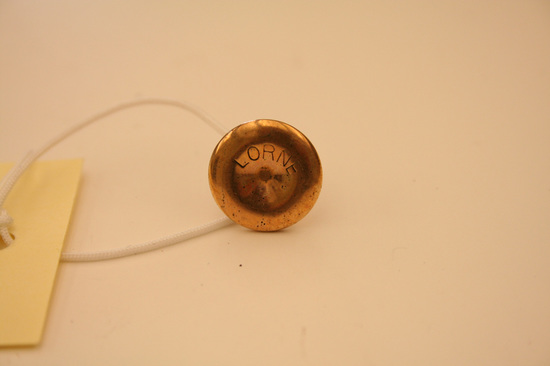 2 gold colored metal collar studs "LORNE" engraved on face of each stud. A: 1/2" diameter front face, 1/2" long B: 1/2" diameter front face, 1/4" long