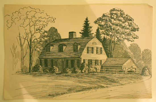 Print of an area home (not yet identified) Cape style house with gambrel roof and three dormer windows across top. Driveway extends along right side of etching with garage built below brade of house. House has center chimney. Trees behind and to side of house. Signed "R. Hinchman"