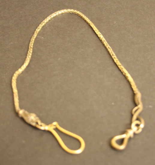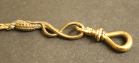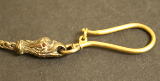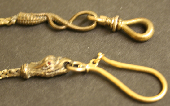 Gold watch chain made of flat pieces of gold woven together to create thicker chain. Pressure loop at one end with swivel top and twisted snake tail with watch loop at end. At the opposite end is a snake or bird's head with a red glass eye holding gold oval shaped hook with clasp in its mouth.