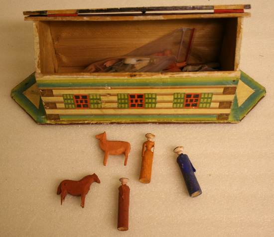 Noah's Ark toy with figures of animals and three people. Ark is on base with triangular ends in the form of a log house with three windows on each side. Windows are painted black with vermillion sash and green cross bar shutters. Door is Dutch type under a triangular lintel casing. In gable ends are triangular linear shaped in vermillion. Log ends appear to be decals of mustard color on black. Top and bottom of logs are ombre green, remainder ivory with grey simulating mortar. Roof is painted pink and red to simulate tile and is hinged at hinge (however hinges are missing) and has a hand wrought metal hook fastener at one side. A white bird with blue wing and crest with a green leaf in its beak is painted on moveable side of roof. In interior are three human figures carved from dowels, one with a wasp waist indicating the figure is female. All have flat coolie hats. There are also 41 whittled animals among which are recognizable - horses, deer, cows, oxen, pigs, 1 elephant, 1 black sheet and 1 purple cow with sand spots. Some animals are painted with oil, others with water based paint. Some are spotted with a sponge and others have spots painted on.
