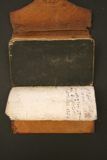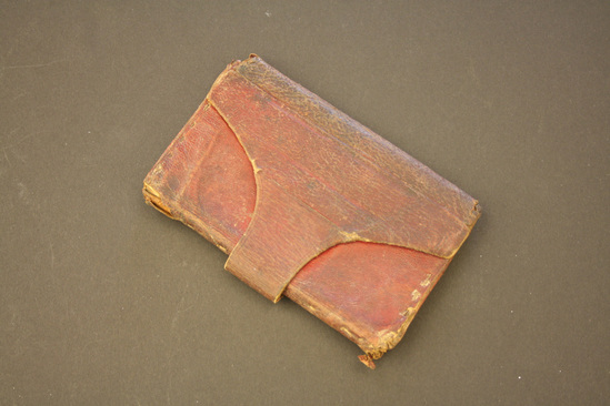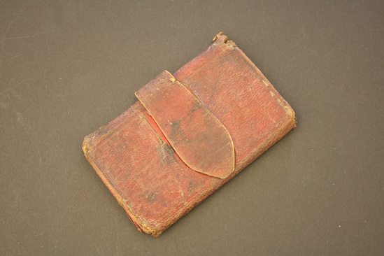 Red leather wallet. Minimal tooling decoration on outside of wallet. Two folds - the first is an outside long shaped flap which is inserted in a band on the outside. The inside has a double accordian pocket lined with marblized paper. The back of the wallet also has a single pocket. Sewed between pockets is a memorandum book consisting of five alternate leaves of paper and four leaves of stiff cardboard/paper which is black on both sides. Two pages have Oliver Wolcott's handwriting
