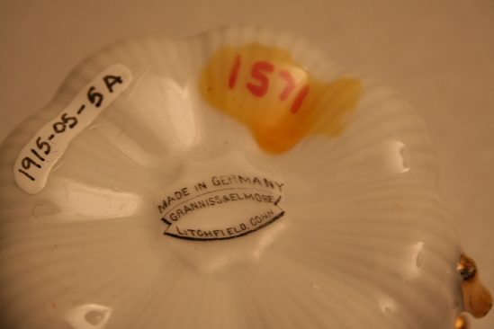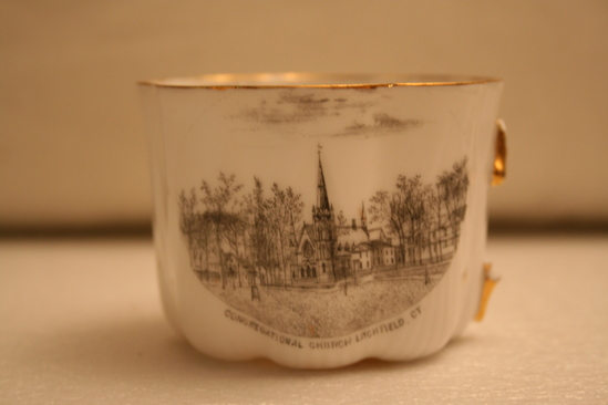 A- Cup with gold scalloped edge. Raised large daisy pattern filing center. On one side lithograph scene of West Street from Mansion House to Court House. Printed underneath "Mansion House Burned June 11, 1886" Handle missing from cup. Stamp on bottom of cup "Made in Germany/Grannis & Elmore/Litchfield/Conn" B - Saucer with grooved side and gold rim. Side of saucer has same lithograph image as cup.