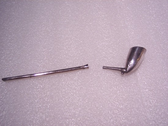 Silver pipe in two parts - stem - straight silver tube 3 3/4" long. Bowl - finger shaped bowl with engraving swags on top rim and down sides. Holes on bottom side where stem is inserted into place.
