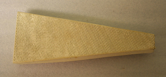 Triangular shaped fan box. Cardboard body covered in white paper with horizontal bands of repeating pressed lines. Overlay of diagonal silver stripes. Bottom covered in white paper.