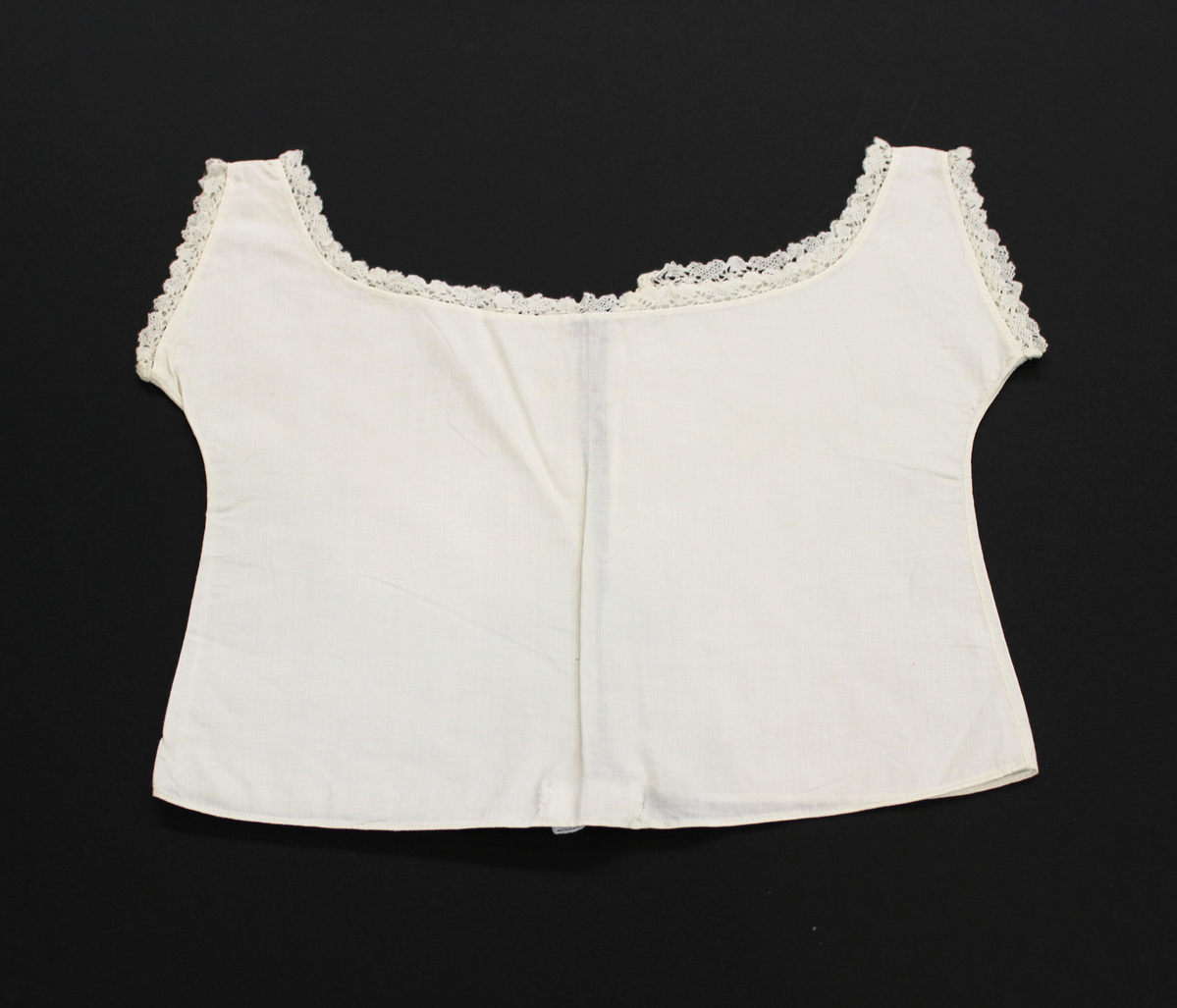 White linen child's undershirt; crocheted lace around neckline and armholes; scoop neckline; shoulder straps; open down back with no closures; hand stitched