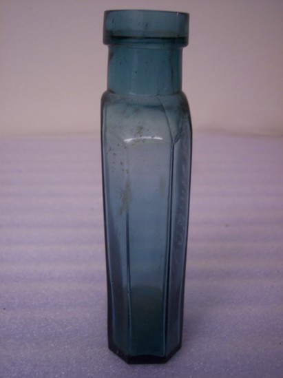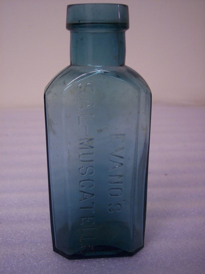 Teal glass bottle with raised lettering on one side "Evano's/Sal- Muscatelle", no stopper