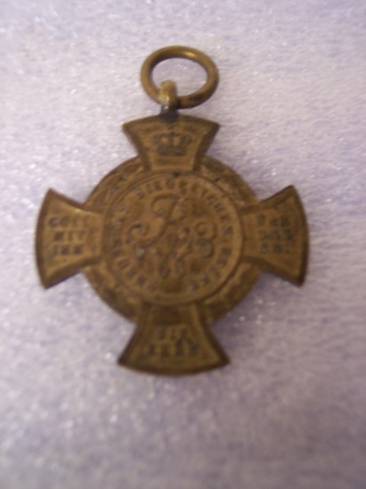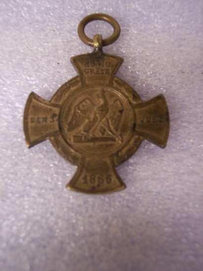 Victory medal of German Austrian War 1866. Loop at top. Malteese cross shape, laurel wreath around center. Obverse side has crowned Prussian eagle in center holding cannon horizontally in claws. At top "KONIG/GRATZ"; at right "JULI"; at bottom "1866"; at left "DEN 3" On reverse side center has image of RV cipher with legend "PREUSSENS SEIGREIGHEM HEERE" Top has image of crown, on the right side "WAR/UNS/SEI"; on the bottom "DIE/EHRE"; on the left "GOTT/MIT/IHM"