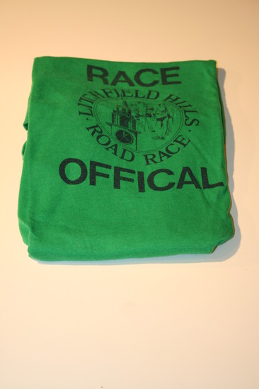 Green shot sleeved t-shirt. Logo printed in center of front of shirt. Circle logo with runners and steeple or clock tower. "Litchfield Hills Road Race" printed around outer edge of logo. "Race" printed above logo. "Official" printed below logo.