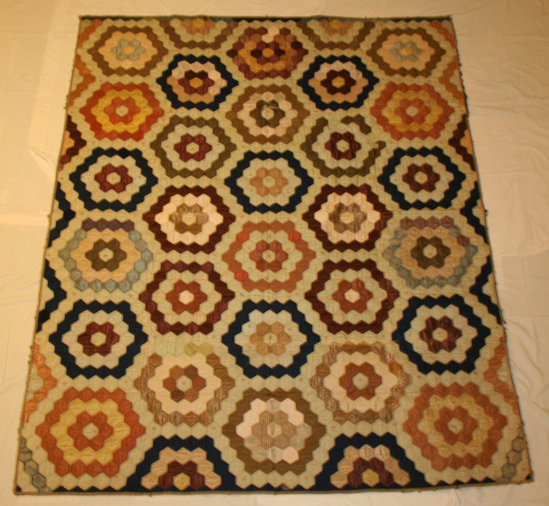 Patchwork coverlet, honeycomb patches in mosaic design of Grandmother's Flower Garden. Five motifs across the length and three across the width, quilted following the design. Fabric of silk taffeta in navy blue, rust, olive green, lavender, peach and yello. A pale green taffeta with a lighter woven stripe and embroidered flowers in silk and metallic threads is used between these colors. Binding of olive taffeta. Backed with aqua and grey linsey woolsey and stuffed with a flannel batting.
