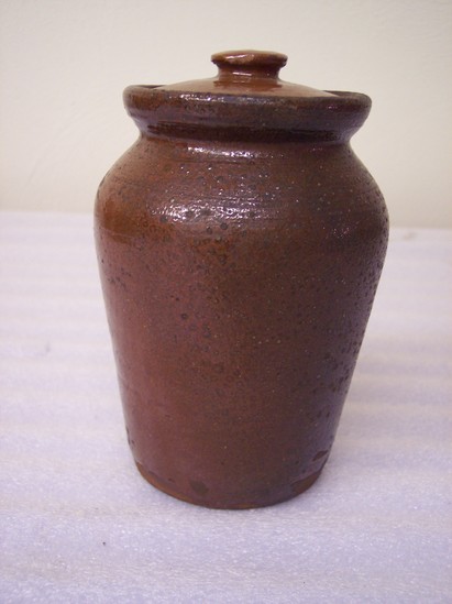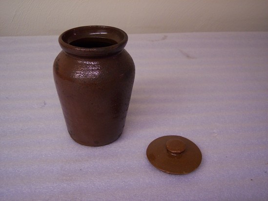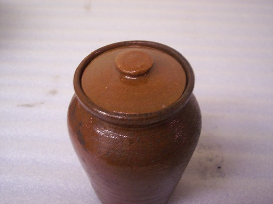 CLEAR GLAZE INSIDE AND OUT. JAR WITH DEFINITE SHOULDERS TAPERS TO PLAIN BASE. ROLLED RIM WITH INCISED LINES. LID IS BEVELLED TO FIT, HAS KNOB-LIKE HANDLE.