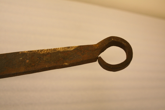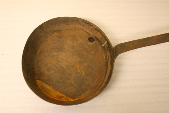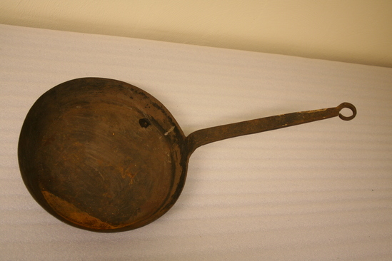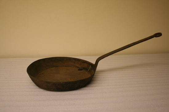Long-handled iron skillet with loop for hanging at the end of the handle.