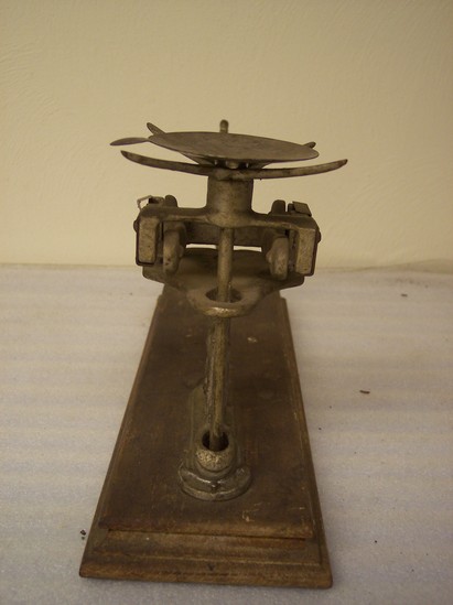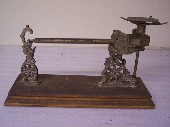 Metal scale with ornate cast metal supports, mounted on a stepped wooden base. Balance pan. Attached metal supports painted silver