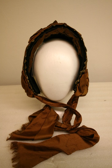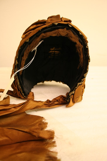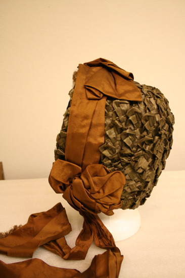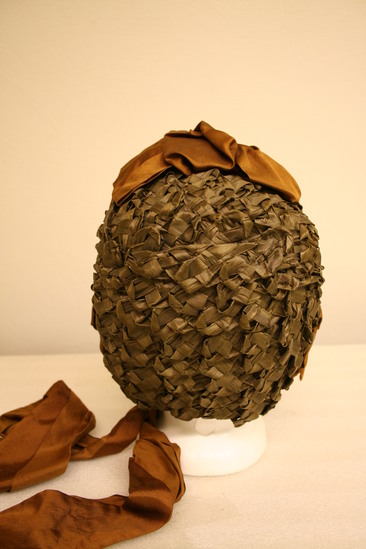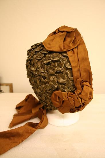 Woman's driving hat; green straw bonnet with brown silk ribbon around brim with three bows; one at the bottom on each side and one at the top; tie strings also brown silk; brim a brown velvet and underside trimmed with brown ruffled lace; interior of black silk; label "Marcella Importer/142 Nassau St. Princeton NJ Tel. No. 48A"