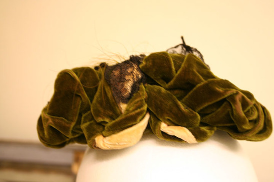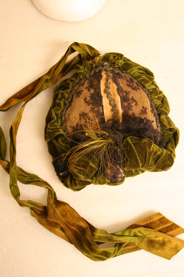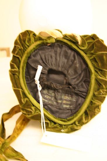 Flat oval hat; trimmed with ruffled green velvet with large twisted green and pink velvet folded up in front with black lace bow and green feather; top light pink velvet covered in black lace and trimmed with gold ribbon; pink velvet strip with gold ribbon down middle; two green ribbons with velvet centers attached to back; label "Mr. Kenzie & Cameron/120 Tremont Street/Room 503/Boston"