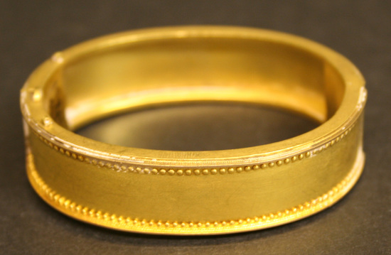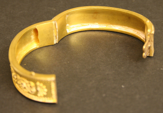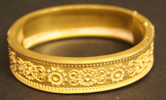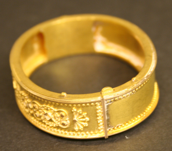 Gold bangle style bracelet, with two opposite hinges, box clasp closure, top surface of bangle with applied filigree decoration on one side.