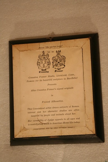 White paper - ink and watercolor image - profile of older man (facing left), newsboy cap, shirt and vest, moustache and pipe in mouth. In bottom left hand corner "Gramp" with signature of artist Alice Cranston Fenner in bottom right hand corner. In black wooden frame with brass ring at top for hanging. Paper label on back of frame with information on Fenner