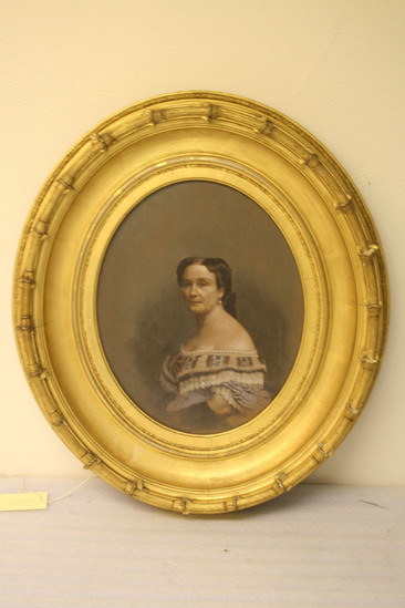 Oil on cardboard, probably painted over a photograph, of a middle aged woman, Charlotte Bellamy Monroe. Bust portrait in an oval frame, dressed in formal off the shoulder lavender gown with elaborate lace bodice. Brown hair worn in a bun, blue/green eyes. Label on back "Prepared Mill-Board/Windsor & Newton/artists' colourmen/to Her Majesty/and to His Royal Highness the Prince Consort/38, Rothbone Place, London, W."
