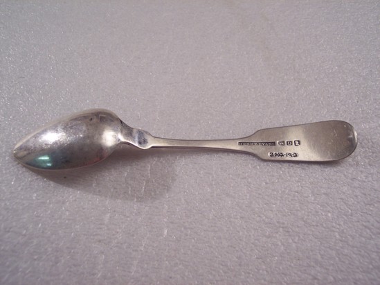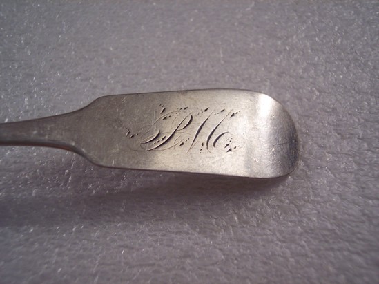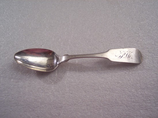 Teaspoon engraved with the initials "PM" on the obverse of the handle. The reverse side contains the name "HENRY EVANS" stamped on handle along with a lion passant, the letter "D" and a bust of a gentleman.