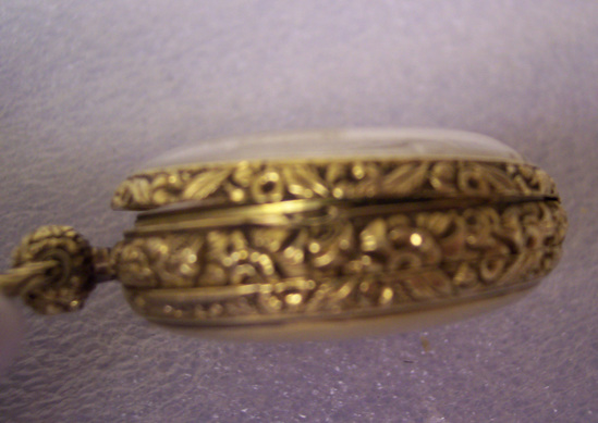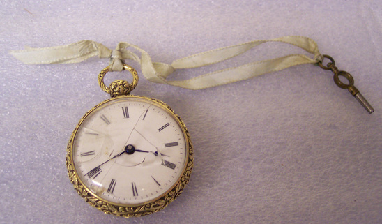 open faced watch with crystal and steel hands, Roman numerals. Sides, knob, and ring heavy floral design casting, back of case engine turning hatching with circle plain center. Key on ribbon. Case has indistinct London hall marks. Works marked: Johs Johnson/26 Church St./Liverpool/5849" Watch belonged to Mrs. Frederick Augustus Tallmadge