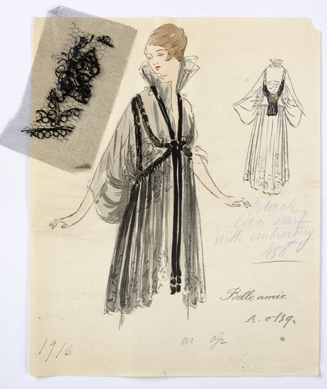 Lithograph and watercolor on paper fashion design. Black lace scarf with embroidery. Fabric samples accompany rendering.