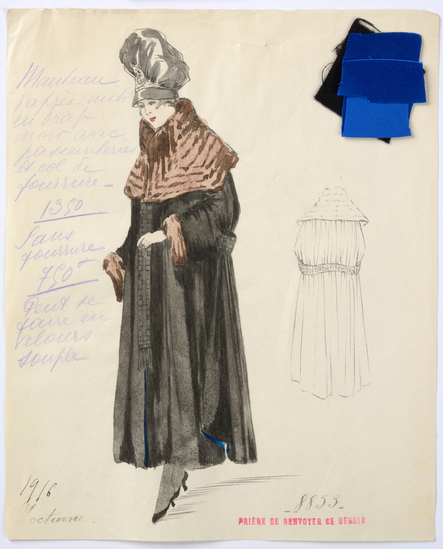 Lithograph and watercolor on paper fashion design. Afternoon coat in black cloth with a fur collar and lace trim. Fabric samples accompany the rendering.