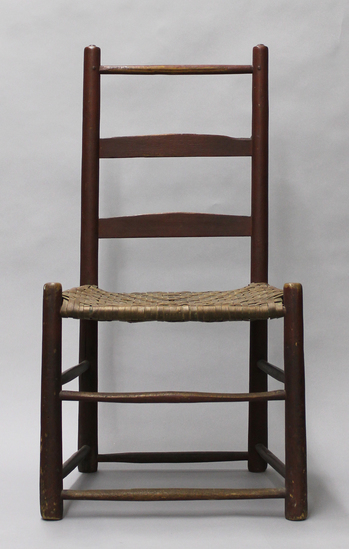 Wooden chair painted red with a caned seat. Chair has double stretchers on front and sides, with single stretcher in back. Back of chair has two thick horizontal slats with a thin round slat above them.