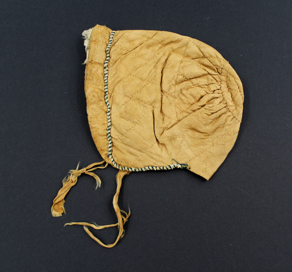 Tan quilted silk child's bonnet; braid at front and sides; off-white silk ruffle inside front; circular section at crown; tan silk ties