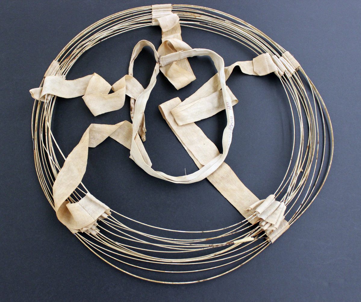 Tan children's wire cage crinoline. Cotton tape waistband with metal buckle. Five tapes suspend from waistband and hold fourteen wire hoops. Stamped on waistband, "Frou-Frou 63."