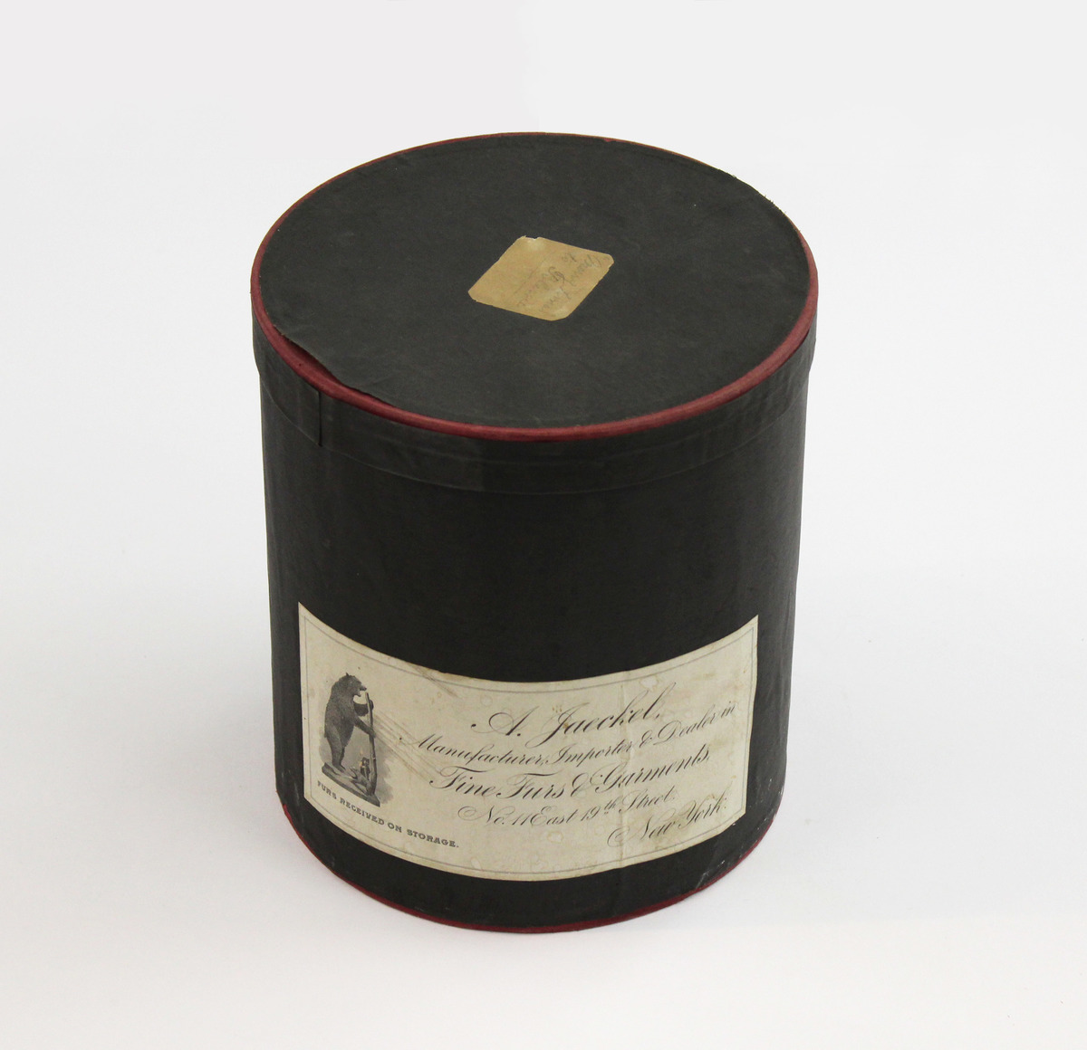 Cardboard cylinder box covered in black paper. Red trim on box lid and bottom. White paper label on front, with image of a bear and what may be two beavers or sables; printed text underneath "FURS RECEIVED ON STORAGE." To the right of the image in printed script, "A. JAECKEL/MANUFACTURER, IMPORTER AND DEALER IN/FINE FURS & GARMENTS/No. 11 EAST 19th STREET/NEW YORK." Small label in center of lid, handwritten, "MERRY CHRISTMAS TO [BLESSIE]."