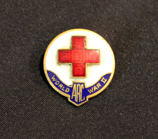 American Red Cross pin. Round and gold. White enamel front with red cross in center of white field. "WORLD ARC WAR II" in gold in blue wave and shield shaped field at bottom of pin.