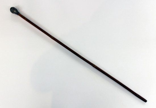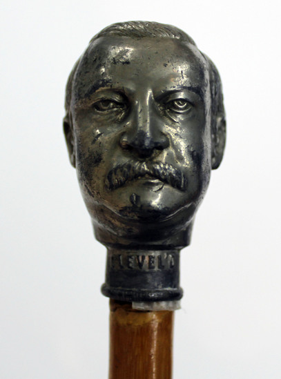 34 ¾" long of bamboo with missing metal tip. Head is bell metal head of Grover Cleveland with collar band with "CLEVELAND" on it, rim before attached to cane. Head is loose and casting seems show. 2 ¼" high head