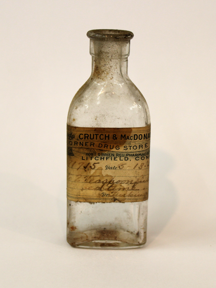 Pressed glass bottle, clear glass, with rounded front corners and beveled back corners with flat back. Short neck with flat rim. Embossed lettering on bottom, "WT" in inverted triangle with "USA" underneath and "8" to the right; embossed "2" on back, below neck. Paper label adhered to front, blue text on off-white, "CRUTCH & MacDONALD/CORNER DRUG STORE/ROB'T O'BRIEN, REG. PHARMACIST/LITCHFIELD, CONN." Prescription information below, handwritten, including prescribing doctor (Turkington).